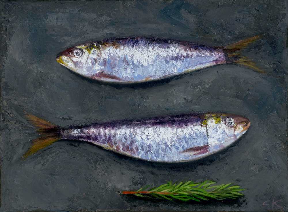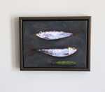 This is a 9x12 in. original oil painting on canvas with a custom metallic pewter floater frame. This painting contains minor flaws (craquelure) in the top fish. Craquelure is characterized by small cracks in the paint due to age/drying process. It happens to most paintings over time and in this case, is barely noticeable.
