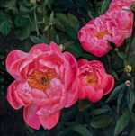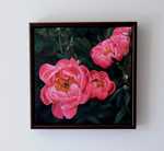 This is a 14x14 in. original oil painting of American-grown coral charm peonies on canvas with a custom bronze floater frame.